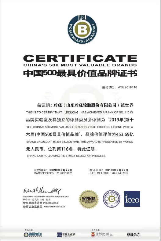 On June 26, 2019, the World Brand Summit, hosted by the World Brand Lab, was successfully held in Beijing. The World Brand Lab released its list of China's 500 Most Valuable Brands in2019. Linglong Tire’s brand value reached 45.369 billion RMB, ranking No.116 in this list, which was a new high for Linglong!