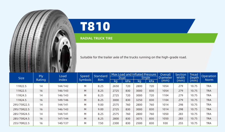 | Specifications | Load Index | Speed Symbol | Standard hub | Standard load | Corresponding pressure (kPa) | Inflatable section width (mm) | External diameter (mm) | Depth of pattern (mm) |