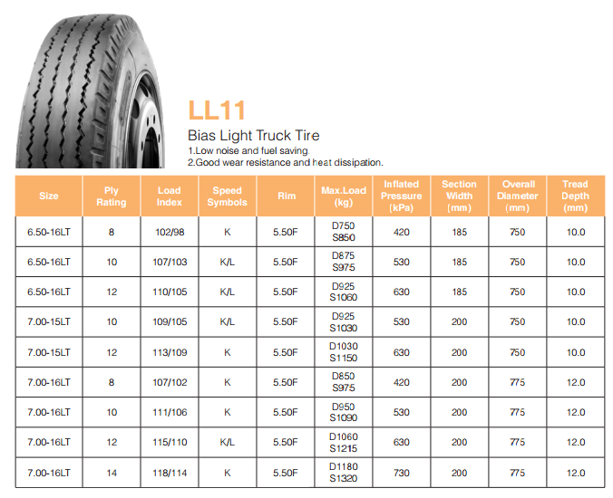 | 7.00-R16 | 10 | - | - | 5.50F | 1100 | 530 | 188 | 760 | 12.0 | TT |